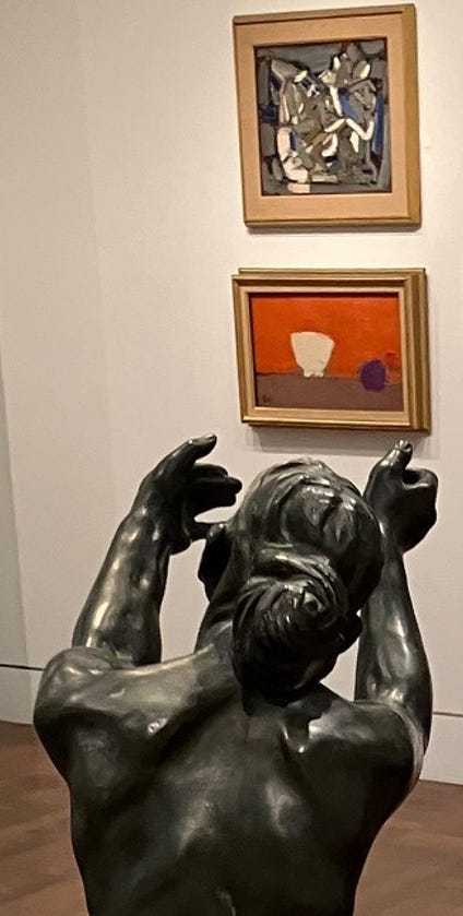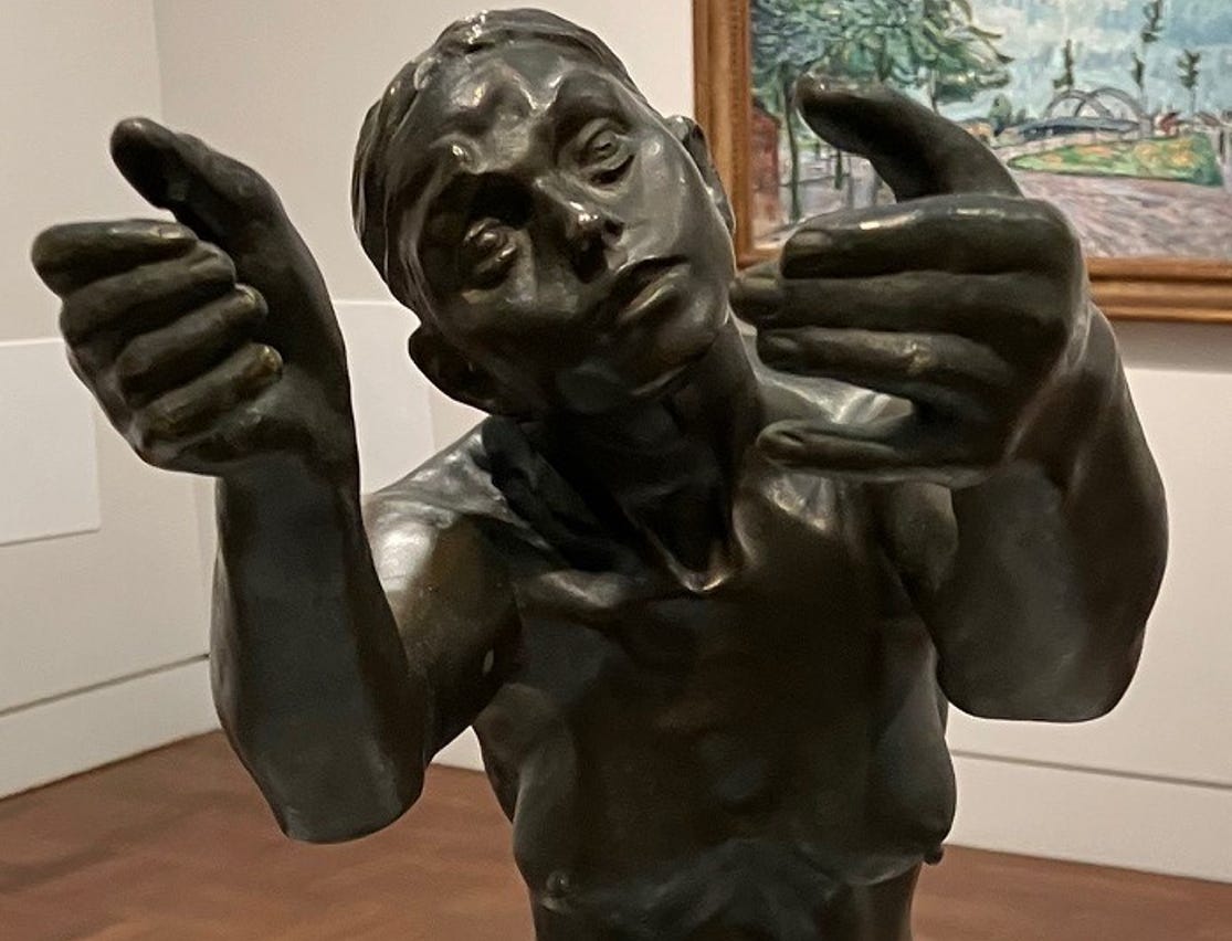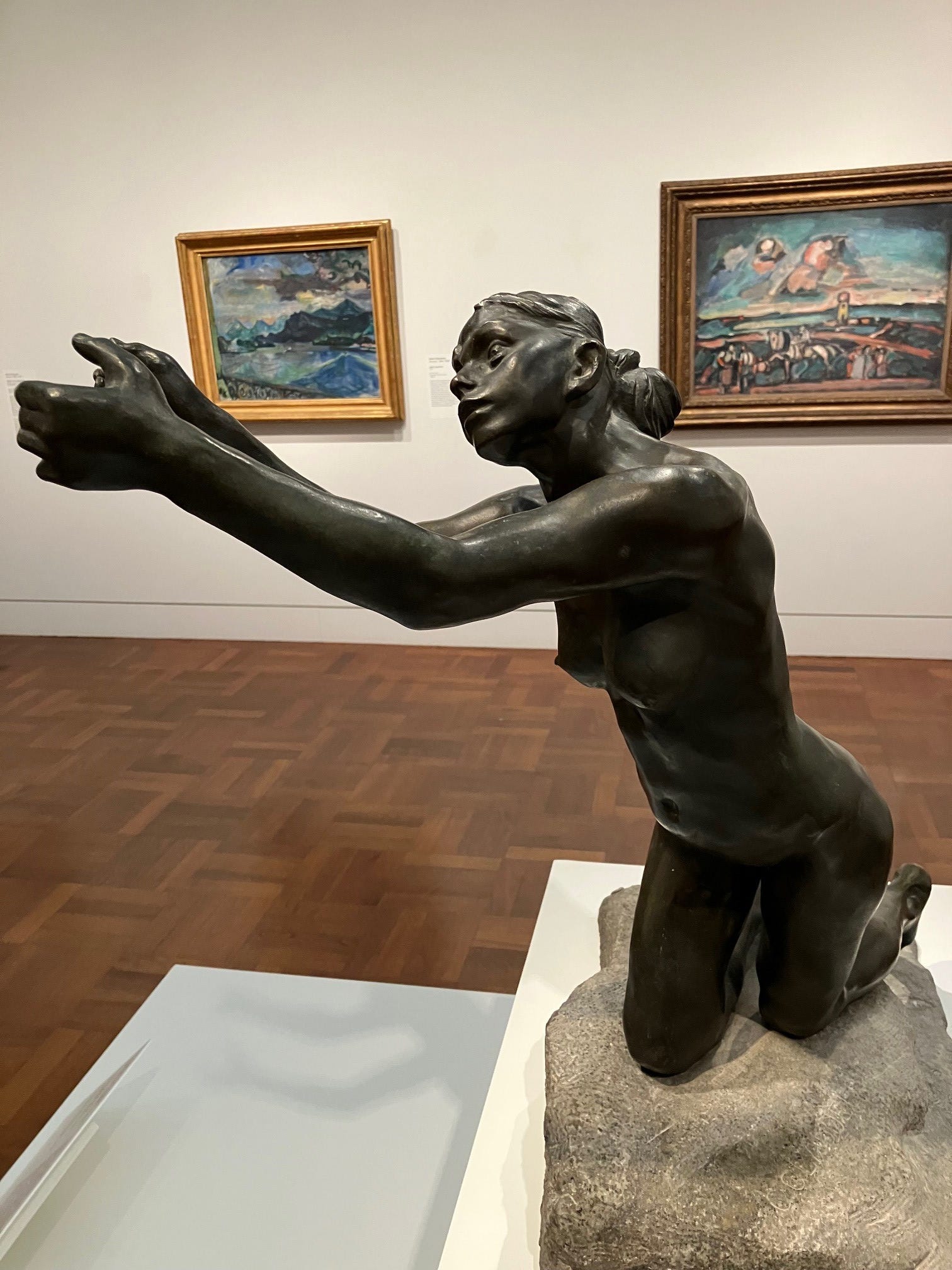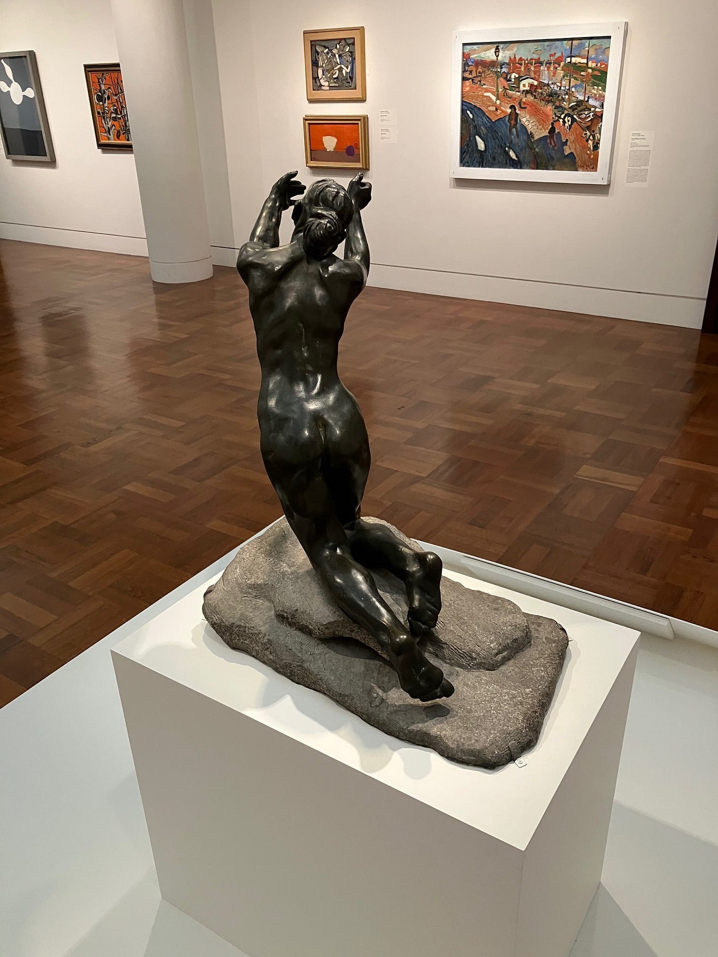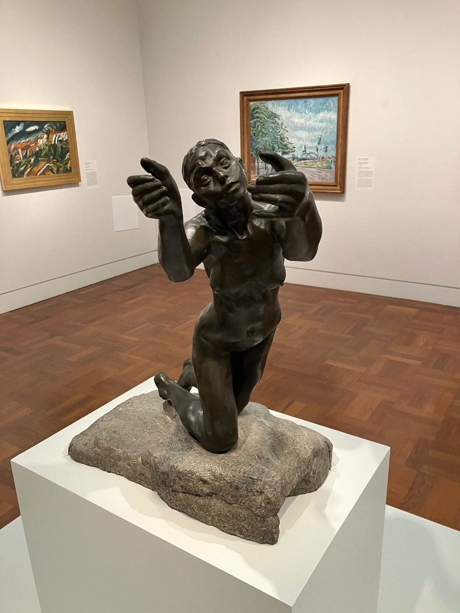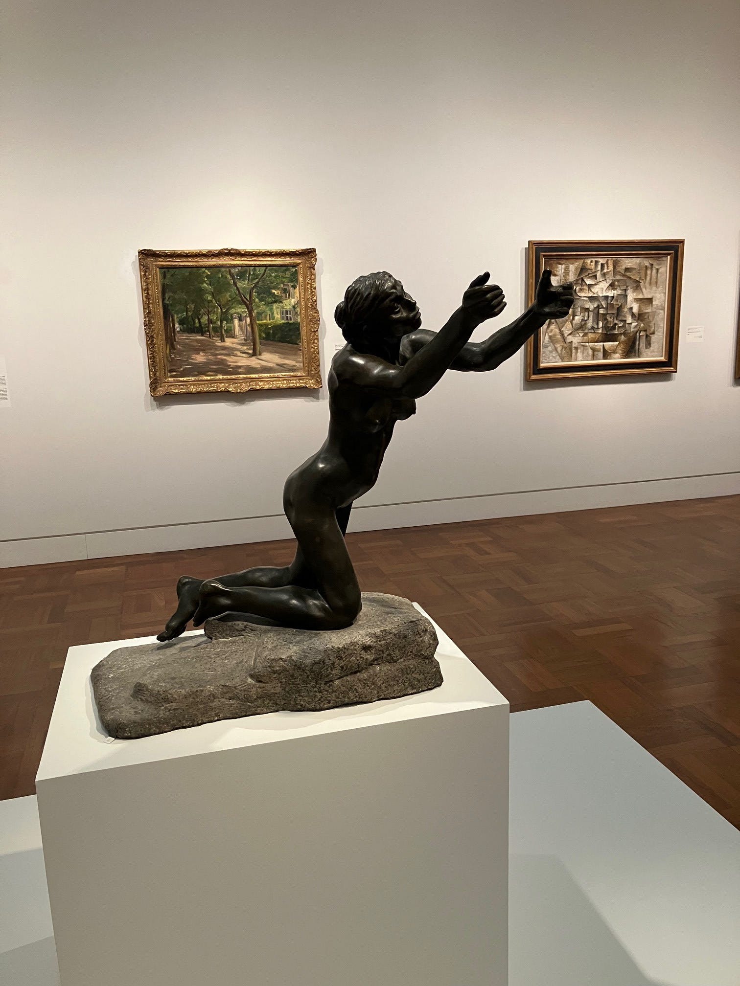 I gradually became conscious of the figure’s placement within the gallery. The Implorer is powerful enough to hold a room, and indeed that was how Rodin’s Burghers of Calais had been displayed. They were set apart from the rest of the museum’s holdings, given pride of place in their own space, inviting exclusive contemplation. Not so with Claudel’s statue. She is placed in the midst of several European Modernist paintings.